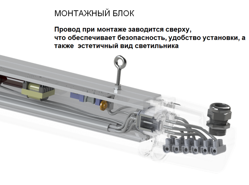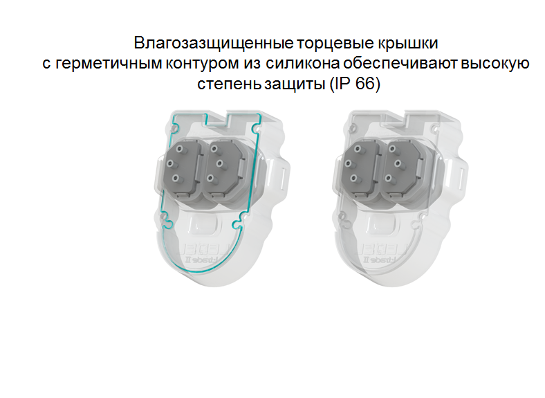 Пластиковые боковые крышки с коннекторами обеспечивают надежное механическое и электрическое соединение светильников.