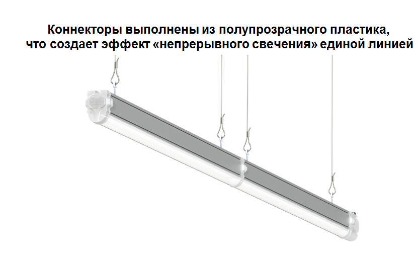 Прочная система торцевого соединения позволяет крепить светильники к потолку или на подвесах через один.